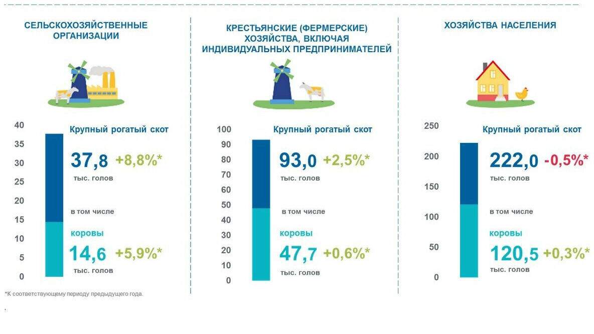 Из них коров – 182,8 тыс. голов. В основном их держат обычные сельские жители. На долю сельхозпредприятий и предпринимателей приходится всего 62,3 тыс. коров.