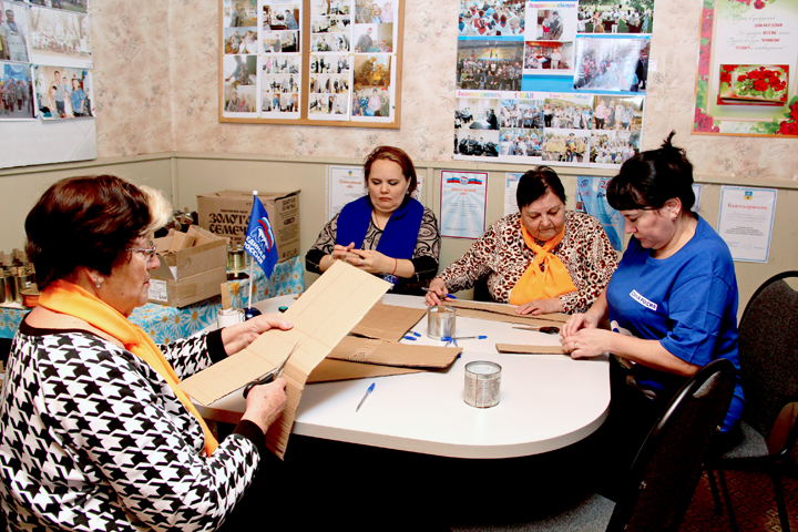 И активисты «Единой России» вместе с председателем гордумы с энтузиазмом приступают к изготовлению наполнителя.