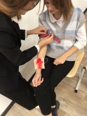Учащиеся продолжают осваивать оказание доврачебной помощи с использованием жгута и накладок имитация кровотечений.