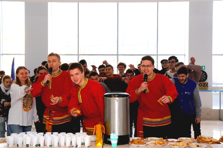 Началось мероприятие с небольшой интеллектуальной разминки на знание русских имен. Сильные и меткие ребята могли показать себя в спортивной зоне праздника, посоревновавшись в жиме лежа и дартсе. А в качестве награды победителей ждал мерч вуза. Но даже те, кто просто пришел за вкусными блинами или сделать памятный снимок в фотозоне, становились участниками розыгрыша фирменной футболки.