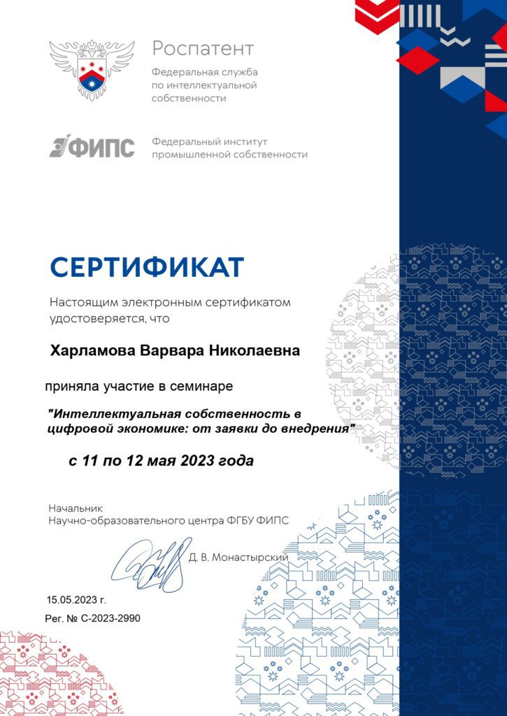 Научно-образовательный центр Федерального института промышленной собственности Роспатента провел семинар «Интеллектуальная собственность в цифровой экономике». Обучение проходило на протяжении нескольких дней, 11-12 мая.