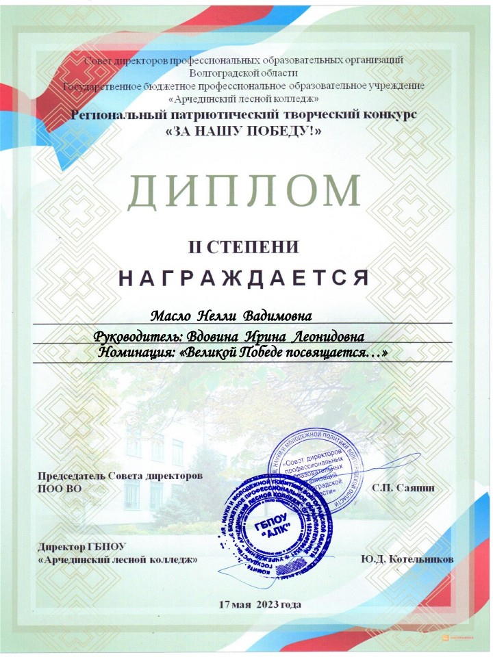 Студенты группы Б-97 приняли участие в региональном патриотическом творческом конкурсе «За нашу Победу!», проводимом ГБПОУ «Арчидинский лесной колледж». Они представили свои работы в номинации «Великой победе посвящается…» и заняли призовые места, получили дипломы 1,2,3 степени Горбатюк Василий, Лухманова Анастасия, Масло Нелли, Ижбердеева Эльвира.