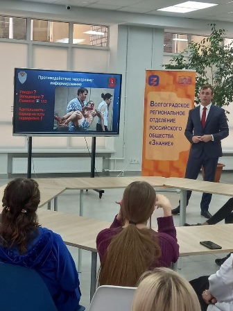 Мероприятие, организатором которого выступила Общероссийская общественно-государственная просветительская организация «Российское общество «Знание», прошло во исполнении комплексного плана противодействия идеологии терроризма, основной спикер – сотрудник аппарата Антитеррористической комиссии в Волгоградской области – Александр Абрамов. Он рассказал о терроризме и чем он опасен для общества и государства в рамках проведения СВО, в том числе лектор отметил, что для украинских террористов важно сформировать атмосферу страха, ужаса и посеять панику среди граждан России. Жертвами террора, как правило становятся обычные люди, которые случайно оказались рядом с местом совершения теракта.