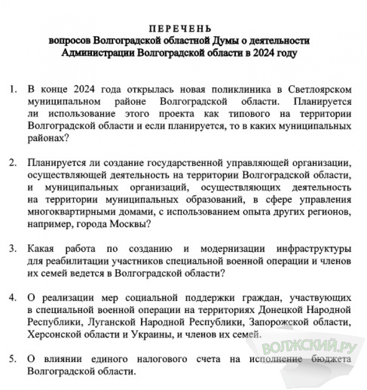 Проект соответствующего постановления опубликовали на сайте регпарламента. Ежегодно глава региона отчитывается перед народными избранниками о проделанной работе, и парламентарии решили дополнить его выступление несколькими важными а их взгляд пунктами. Как узнал Волжский.ру из документа ( подробнее... ), в перечне всего 5 вопросов. Первый касается строительства в прошлом году поликлиники в Светлоярском районе и возможности использовать проект как типовой.
