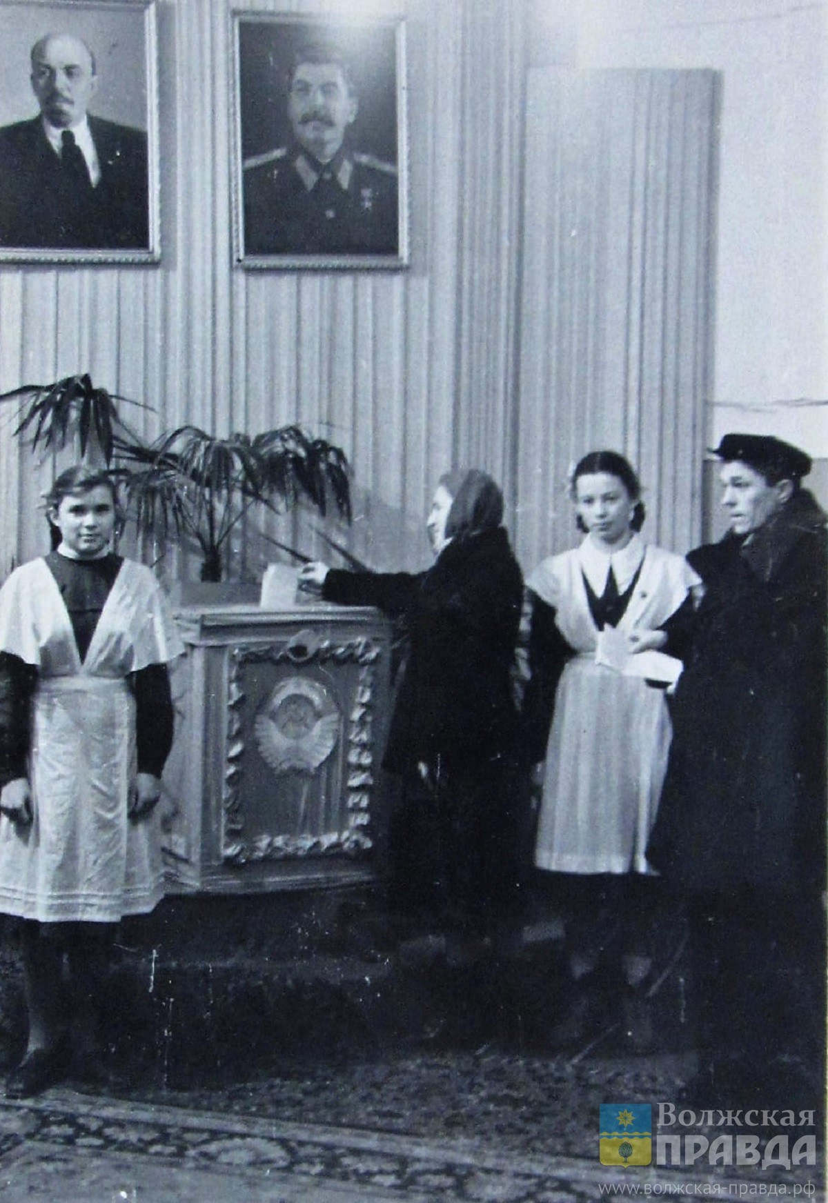 На выборы жители молодого города шли целыми семьями. Лозунги и портреты вождей на избирательных участках советского времени — обычное явление. На одной из сохранившихся в архивах фотографий можно увидеть разукрашенное к выборам здание волжской школы № 1, которая тогда находилась на ул. Комсомольской, 22. Сейчас в том здании размещаются мировые судьи.