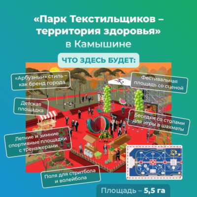 В Камышине проект назван «Парк Текстильщиков — территория здоровья». Как ранее сообщал ИНФОКАМ, сумма гранта составила 106 млн рублей. На эти средства в парке будут создана спортивно-оздоровительная часть: зимние и летние спортивные дорожки (вело- и для лыж), скалодром, памп-трек, тренажерная площадка, поля для стритбола, волейбола, беседки со столами игры в шахматы, детская площадка и другие объекты. Предусмотрена фестивальная площадь со сценой, созданная в «арбузном» стиле, что должно напоминать о бренде города. Общая территория благоустройства составит 5,5 га.