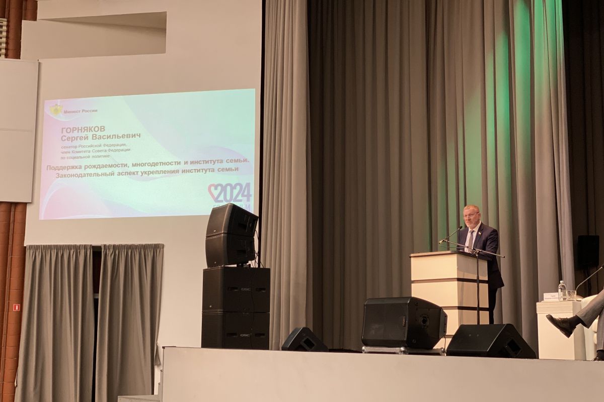 Выступление сенатора было посвящено законодательному аспекту поддержки рождаемости, многодетности и института семьи в России. Существенная часть доклада была отведена роли верхней палаты российского парламента и особенно Председателя Совета Федерации Валентины Матвиенко в вопросах правового регулирования содействия рождаемости, поддержки материнства и детства. Сергей Горняков охарактеризовал работу СФ в области демографии и семейной политики как системную, непрерывную и последовательную, представив множество примеров участникам конференции.