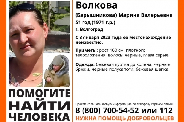Волонтеры подключились к поискам 51-летней жительницы Волгограда. Женщина ушла из дома 8 января 2023 года, и с того момента о ее местонахождении ничего неизвестно.