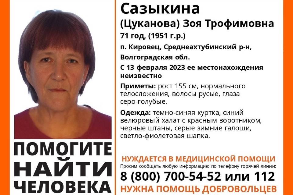 Неравнодушных волгоградцев просят помочь в поисках 71-летней Зои Трофимовны Сазыкиной. Женщина исчезла 13 февраля 2023 года из поселка. Кировец, Среднеахтубинского района Волгоградской области. О случившемся сообщают добровольцы поискового отряда "ЛизаАлерт".