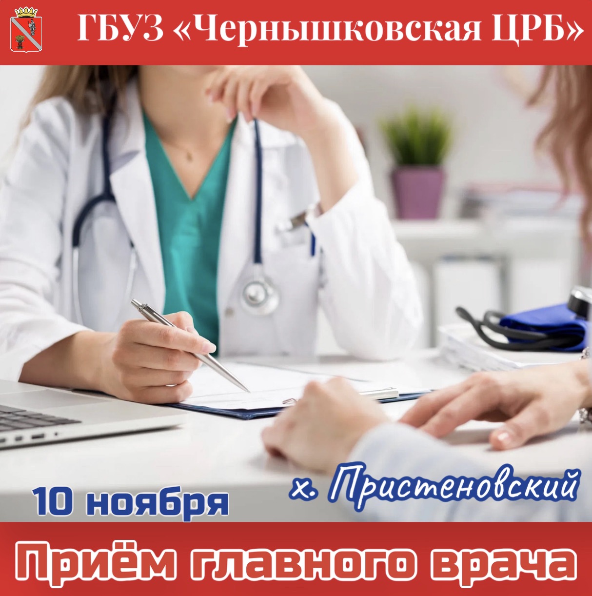 10 ноября в 13:30 в х. Пристеновском главный врач ГБУЗ "Чернышковская ЦРБ" Чернозубова О.В. проведет личный прием граждан.