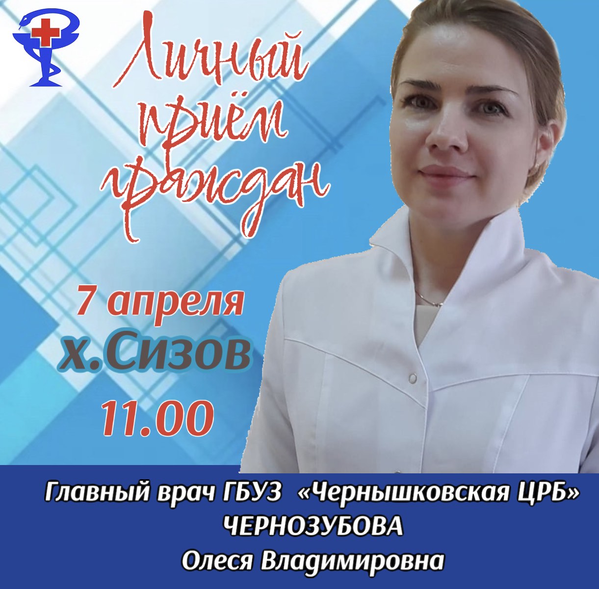 Главный врач ГБУЗ "Чернышковская ЦРБ" Чернозубова О.В. продолжает проводить еженедельные личные приемы граждан: