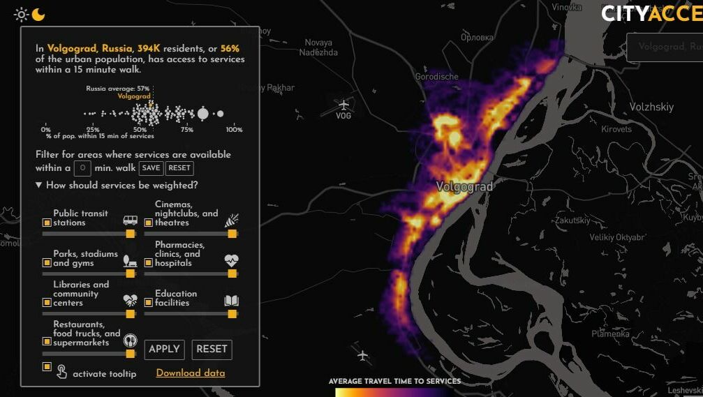 Волгоград достаточно неравномерно развит Фото: CityAcessMap.comПо данным международной платформы CityAcessMap , по уровню комфорта городской среды Волгоград слегка не дотянул до среднего показателя по стране — 56% горожан имеют в пешей доступности все необходимое, при общероссийском показателе в 57%.