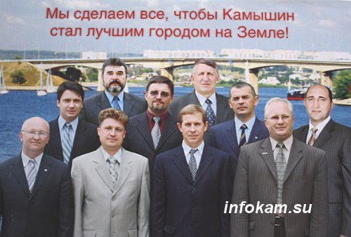 Любопытной особенностью тех выборов стала «команда» или «десятка» мэра. Ее составили (см. фото) : Олег Жерносек, Станислав Зинченко, Владимир Соловьев, Николай Малыгин (нижний ряд); Евгений Полянин, Игорь Скрипкин, Дмитрий Крикунов, Сергей Раот (средний ряд); Юрий Чумаков и Анатолий Хоботов (верхний ряд). Все эти кандидаты являлись на то время директорами (либо гендиректорами) крупных предприятий и фирм. То есть были теми самыми «промышленниками и предпринимателями», о которых так часто упоминается при рассказе о Камышине, его славном прошлом, настоящем и будущем.