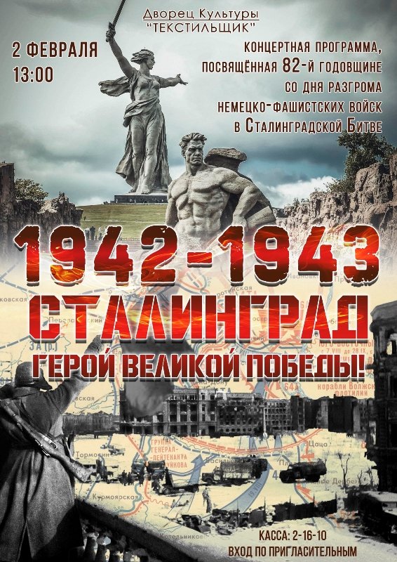 2 февраля в 13.00 часов в ДК «Текстильщик» состоится концертная программа, посвященная 82-й годовщине со дня разгрома немецко-фашистских войск в Сталинградской битве «СТАЛИНГРАД-ГЕРОЙ ВЕЛИКОЙ ПОБЕДЫ»!