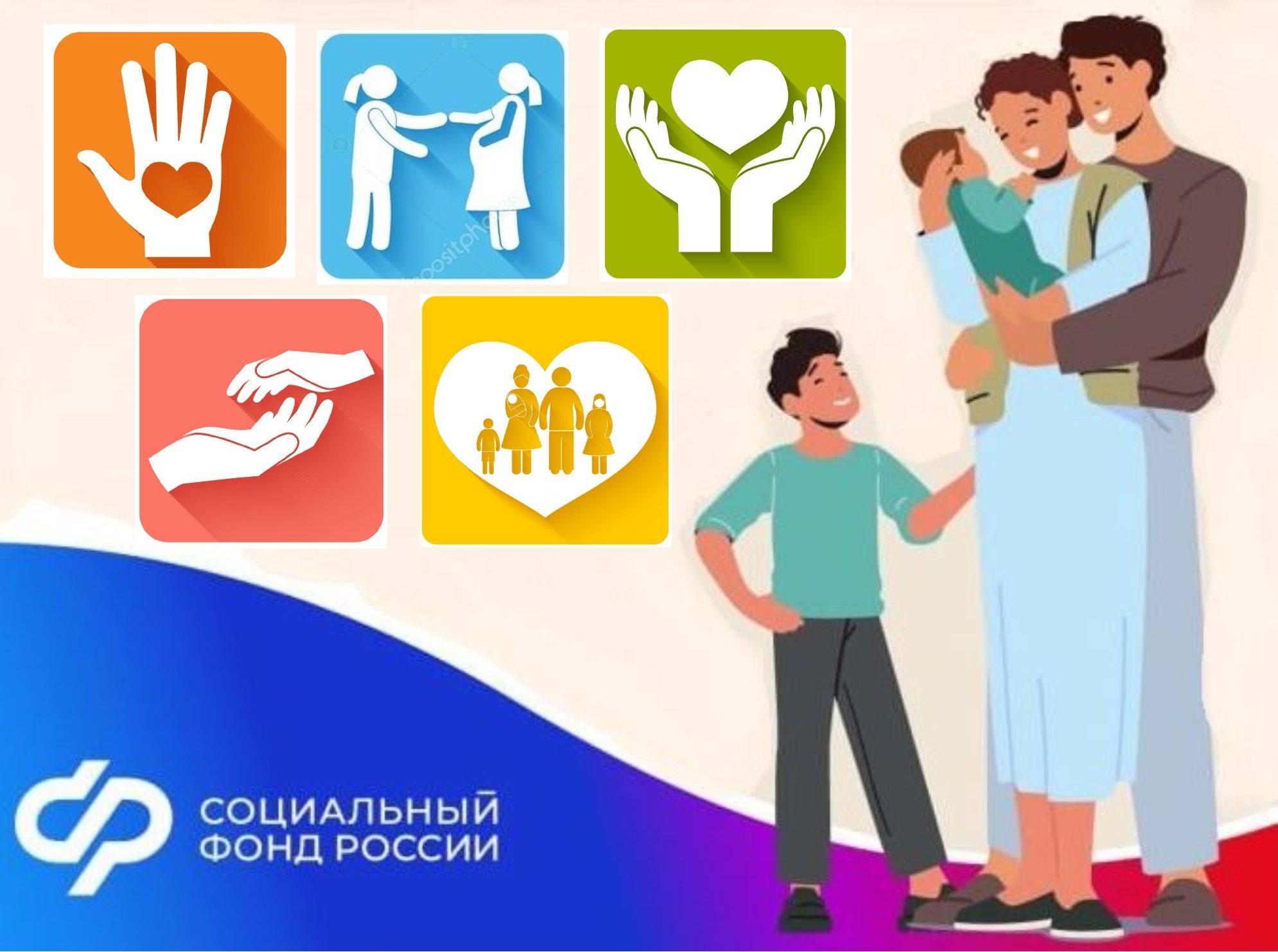 Кроме того, СФР выплачивает единовременное пособие при усыновлении ребёнка и ежемесячное пособие по уходу за ребёнком-инвалидом, обеспечивает пенсионные выплаты: детям-инвалидам, по случаю потери кормильца, многодетным женщинам.