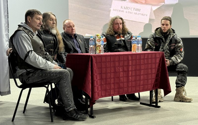 Герой России Евгений Капустин (в центре) в окружении мотоциклистов 12 февраля в кинотеатре «Красная звезда» состоялось масштабное патриотическое мероприятие,