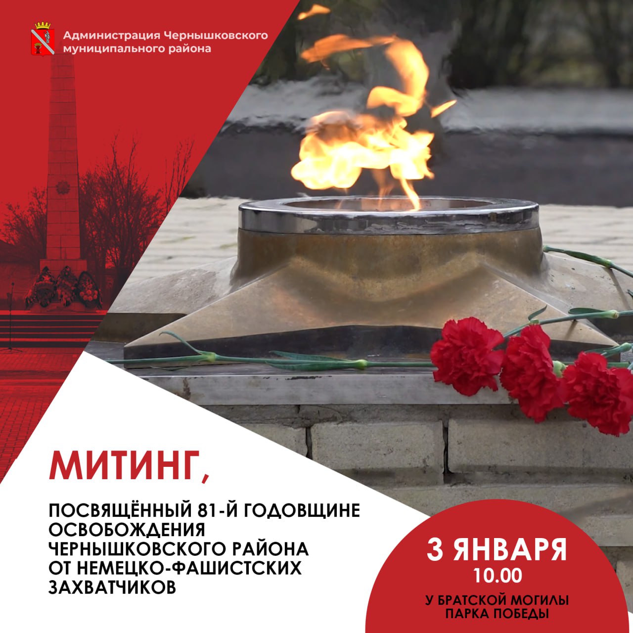 Уважаемые жители и гости района! В среду, 3 января, у братской могилы в парке Победы пройдёт митинг, посвящённый 81-й годовщине освобождения Чернышковского района от немецко-фашистских захватчиков.