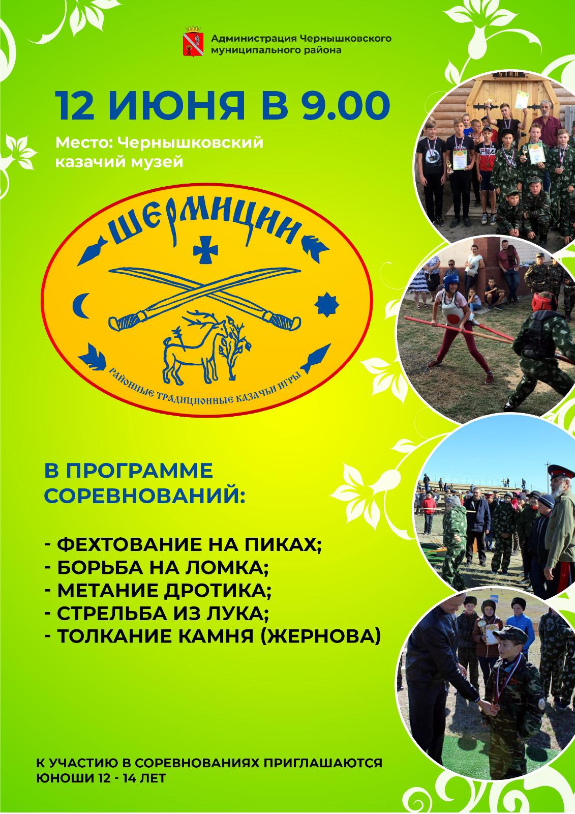 Уважаемые жители и гости района! Дорогие ребята! Приглашаем вас принять участие в традиционных соревнованиях "Шермиции", которые пройдут в День России, 12 июня, на территории Чернышковского казачьего музея.