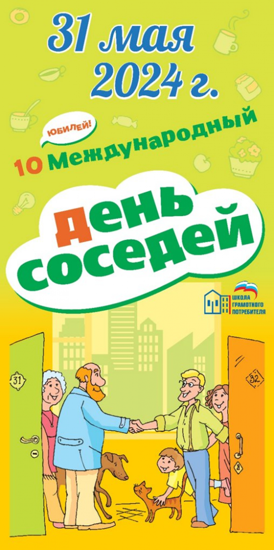 Отметим, что в этом году Всероссийская акция «Международный день соседей», инициированная федеральным партийным проектом «Школа грамотного потребителя» и Министерством строительства и жилищно-коммунального хозяйства Российской Федерации, отмечает юбилей – она состоится в десятый раз. Цель акции — объединение жителей многоквартирных домов и ТОСов, повышение их грамотности в сфере ЖКХ.