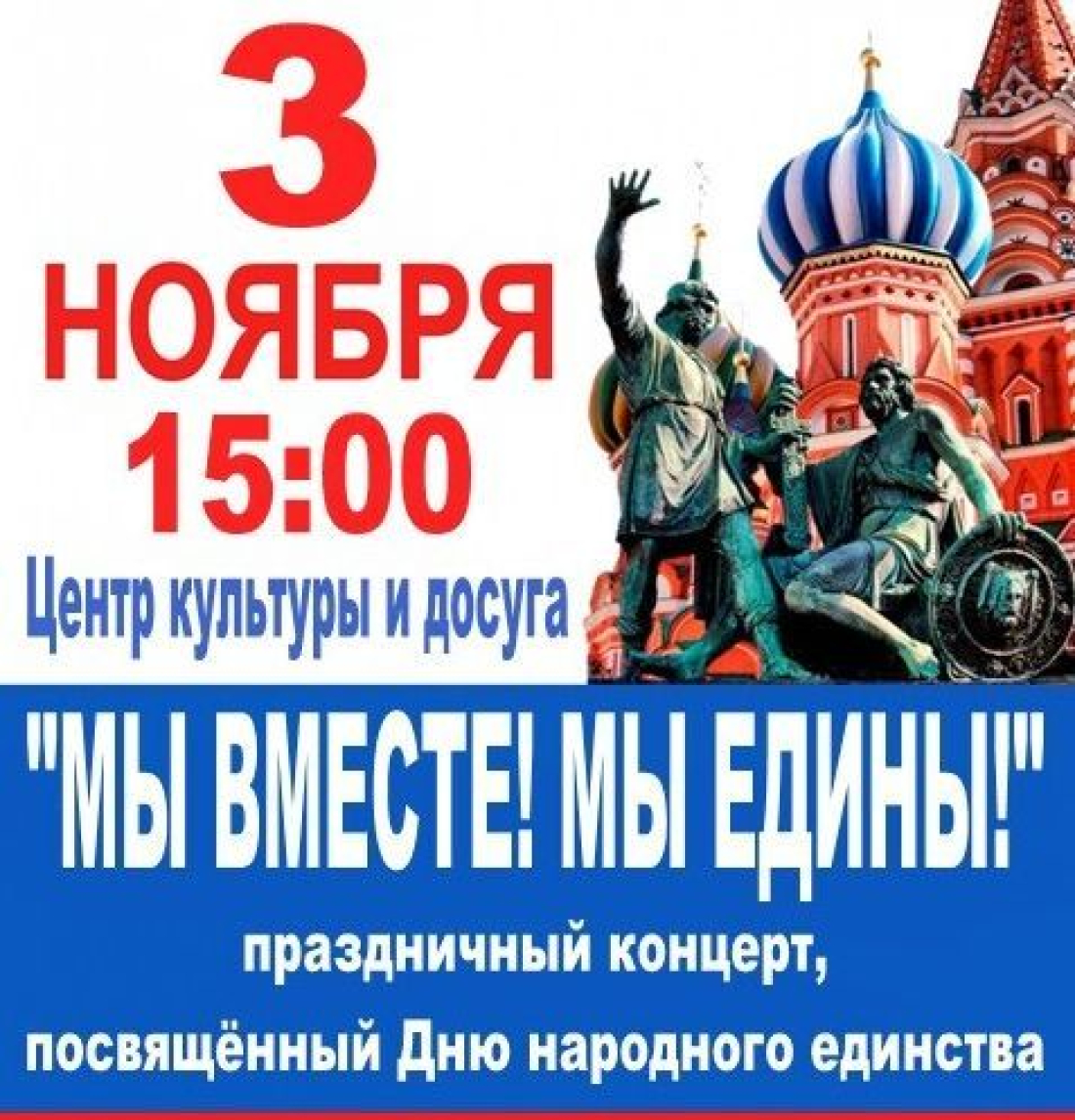 В зрительном зале Центра культуры и досуга р.п. Быково 3 ноября в 15.00 состоится праздничный концерт, посвященный Дню народного единства «Мы вместе – мы едины».