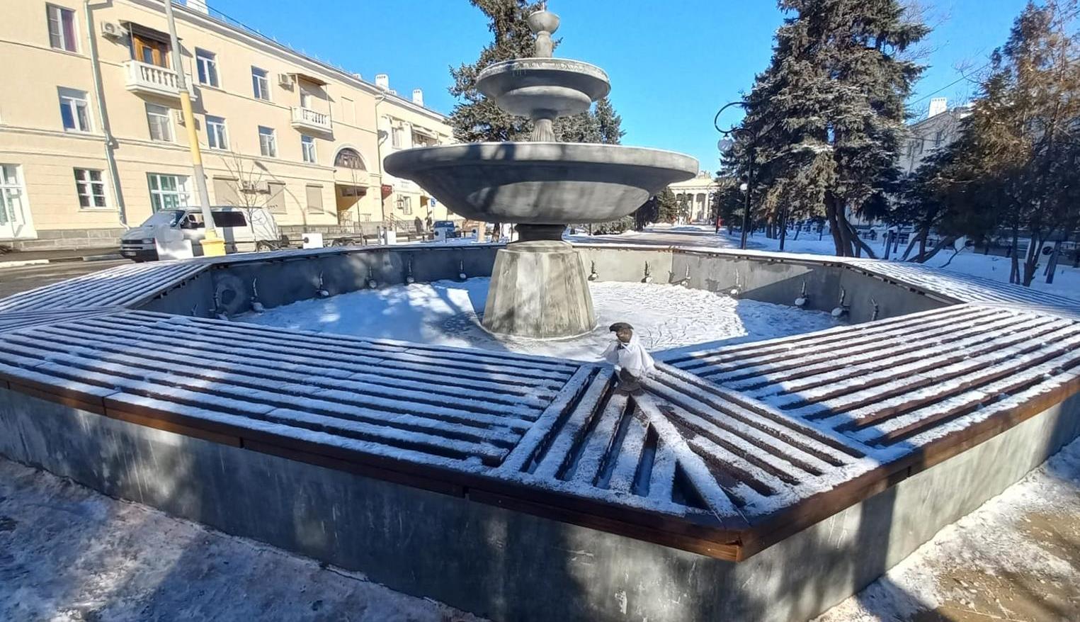 По обращениям горожан и активистов-общественников было принято решение о дополнительных мероприятиях по благоустройству центрального фонтана – в частности, устройстве настила на широких бортах нижней чаши. Эти работы были выполнены за счет сложившейся в ходе ремонта экономии средств. Деревянный настил уложен по периметру нижней чаши и является своеобразной скамьей. Особенно востребованным это место станет в жаркий день, когда отдыхающие смогут расположиться здесь, в непосредственной близости к фонтану.