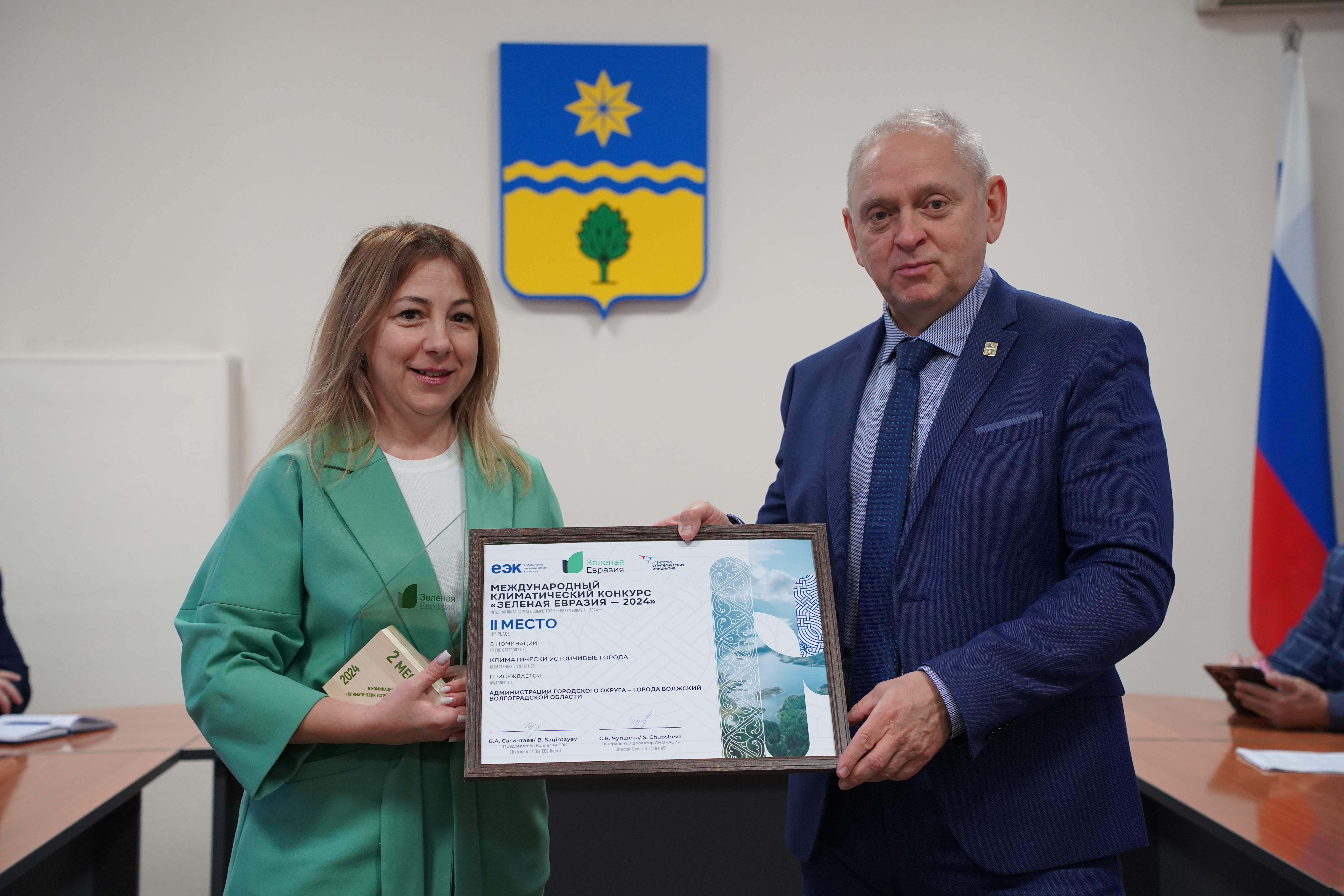 Накануне на еженедельном аппаратном совещании в администрации Волжского глава города Игорь Воронин получил диплом и памятный знак за второе место, которое занял муниципалитет в Международном климатическом конкурсе «Зеленая Евразия». Награду мэру передала его заместитель Татьяна Волкова, которая курирует вопросы экономического развития города, в том числе и реализации инновационных проектов, связанных с использованием альтернативных источников энергии.