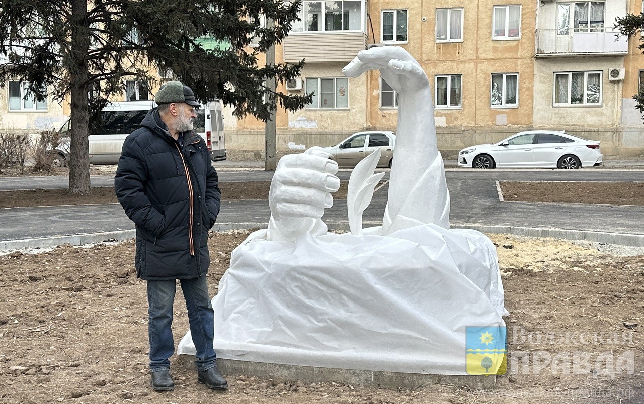 Новый памятник представляет собой скульптурную композицию из двух рук, которые оберегают проклюнувшийся на свет небольшой росток. Все её элементы выполнены из композитного материала белого цвета, который по замыслу художника предаёт новому арт-объекту торжественности. Автором памятника является известный в Волжском скульптор Николай Карпов . Его руке принадлежит памятник Матерям и детям Сталинграда, Александру Александрову , Петру Филютовичу , а также ставшие известными уже практически на всю страну суслики , рассредоточенные по старой части города.
