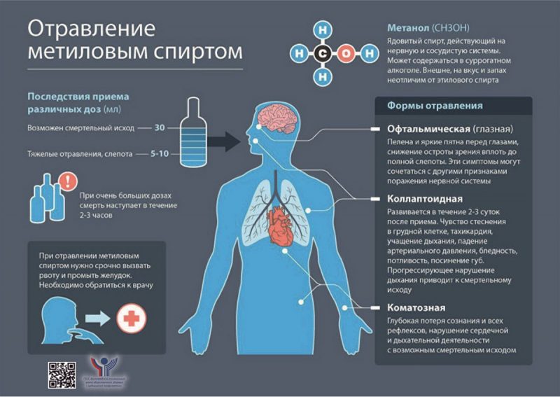 – Метанол, или метиловый спирт, относится к суррогатам алкоголя – спиртосодержащим жидкостям, применяемым для технических нужд и в быту. Метанол используется в качестве добавки к жидкому топливу для двигателей, а также как растворитель при производстве лаков. По вкусу и запаху он не отличается от этилового спирта, однако является смертельным ядом. Прием внутрь 10 мл метанола ведет к тяжелейшему отравлению, смертельная доза – 80-100 мл. Первыми признаками отравления являются тошнота, рвота, появление мушек перед глазами. Спустя некоторое время возникают жажда, боли в животе, головокружение, головная боль, сильные боли в икроножных мышцах, двоение в глазах, снижение зрения вплоть до слепоты. По мере ухудшения состояния появляются судороги, нарушается сердечный ритм, падает давление, развивается коматозное состояние и наступает смерть.