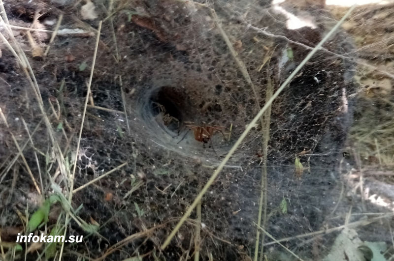 Пауки поджидают добычу в дупле упавшего дереваТак как большинство пауков в области не представляют опасность для людей, то о них говорят меньше всего. Но не стоит сбрасывать со счетов таких представителей этого отряда членистоногих, как каракурт и жёлтый сак. Укус каракурта вообще определяется как «смертельный».