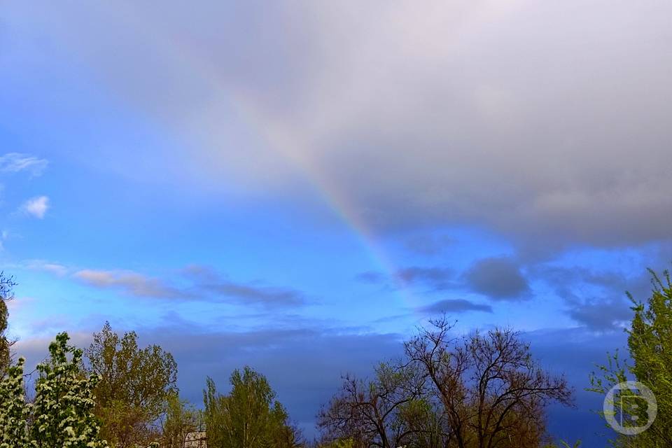 Сильный дождь, который сегодня, 22 апреля, прошел в Волгограде, умыл городские улицы и стал причиной образования в небе яркой радуги.
