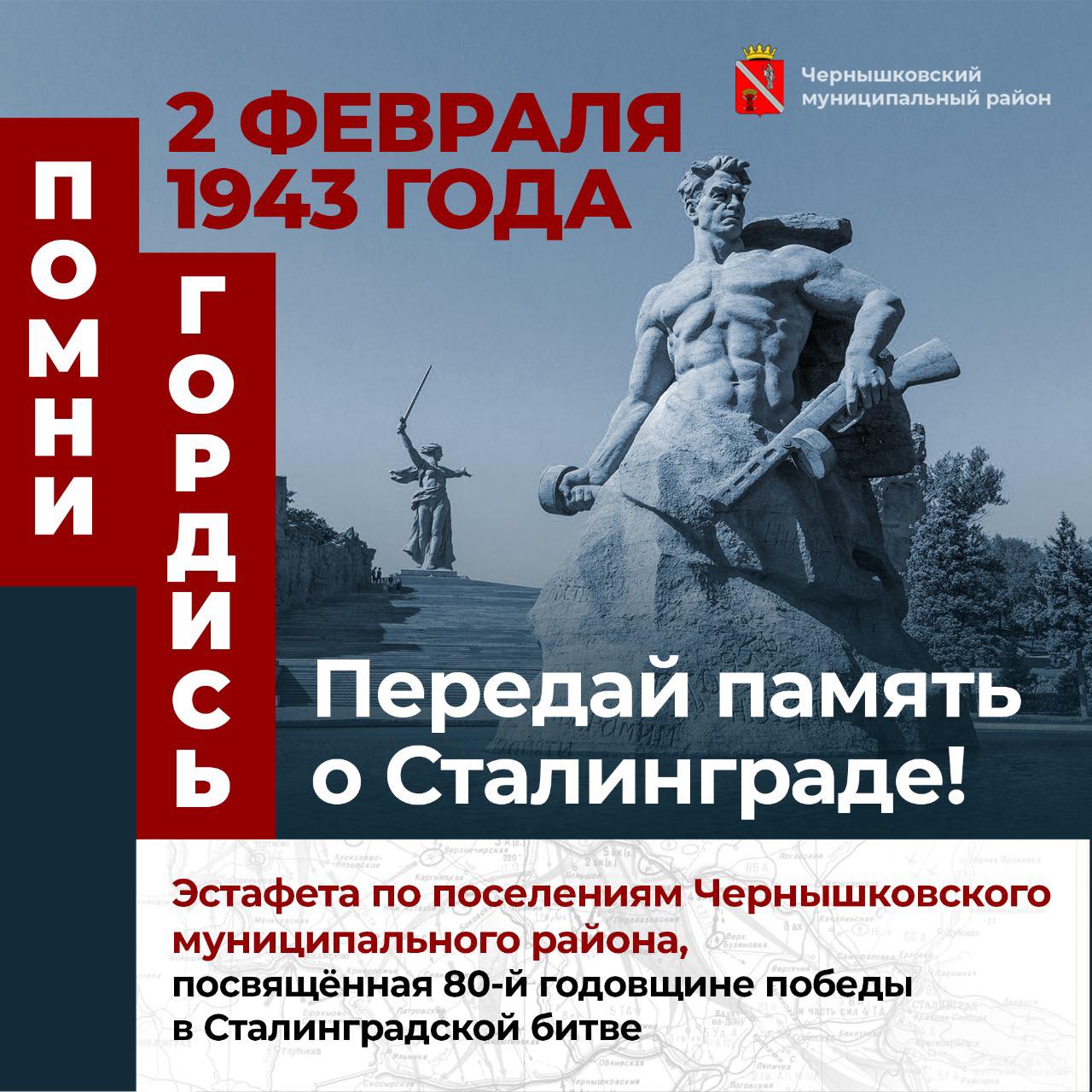 Уважаемые жители района! Стартовала эстафета «Помни, гордись, передай память о Сталинграде", посвященная 80-й годовщине разгрома немецко-фашистских войск под Сталинградом.