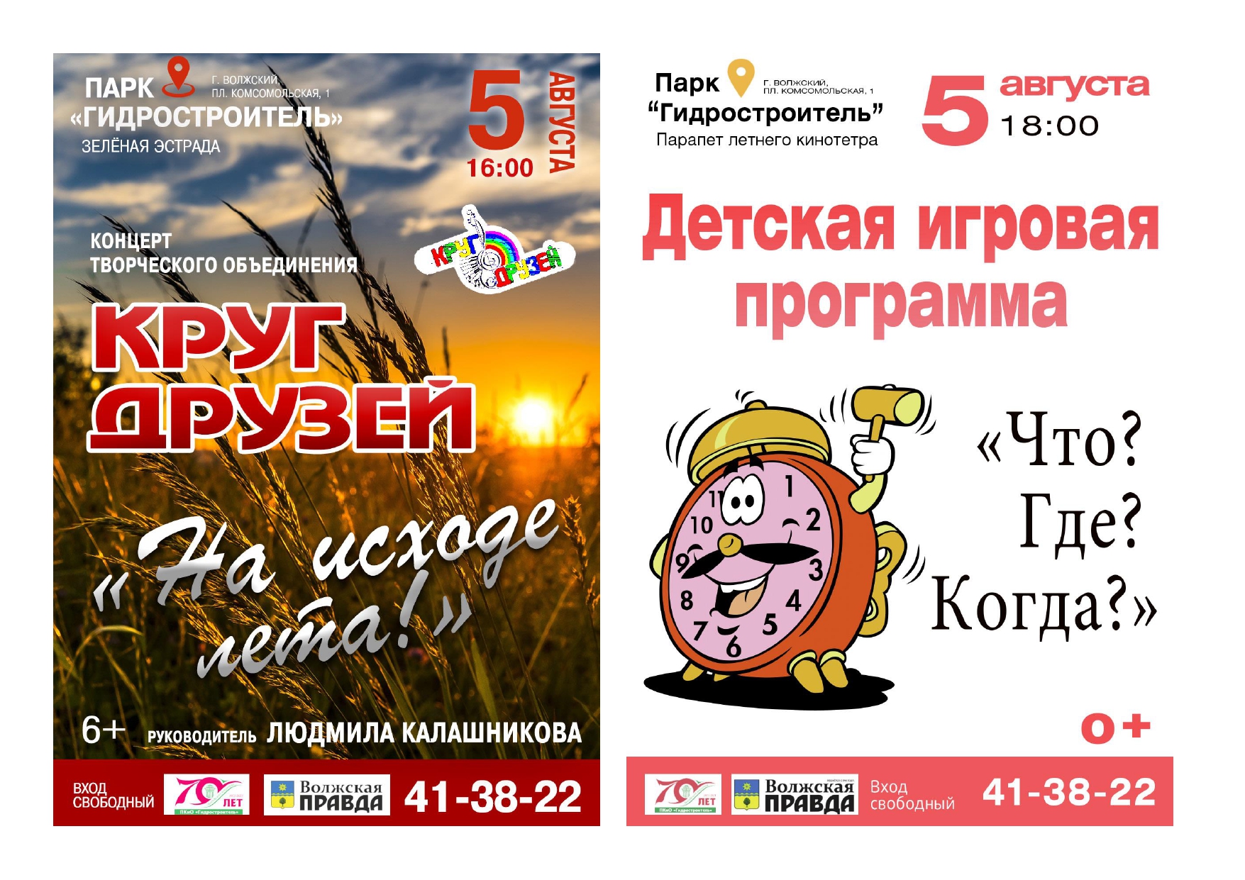 В 16:00 в субботу, 5 августа, в парке «Гидростроитель» на зеленой эстраде состоится концерт творческого объединения «Круг друзей» под названием «На исходе лета!», руководитель Людмила Калашникова.