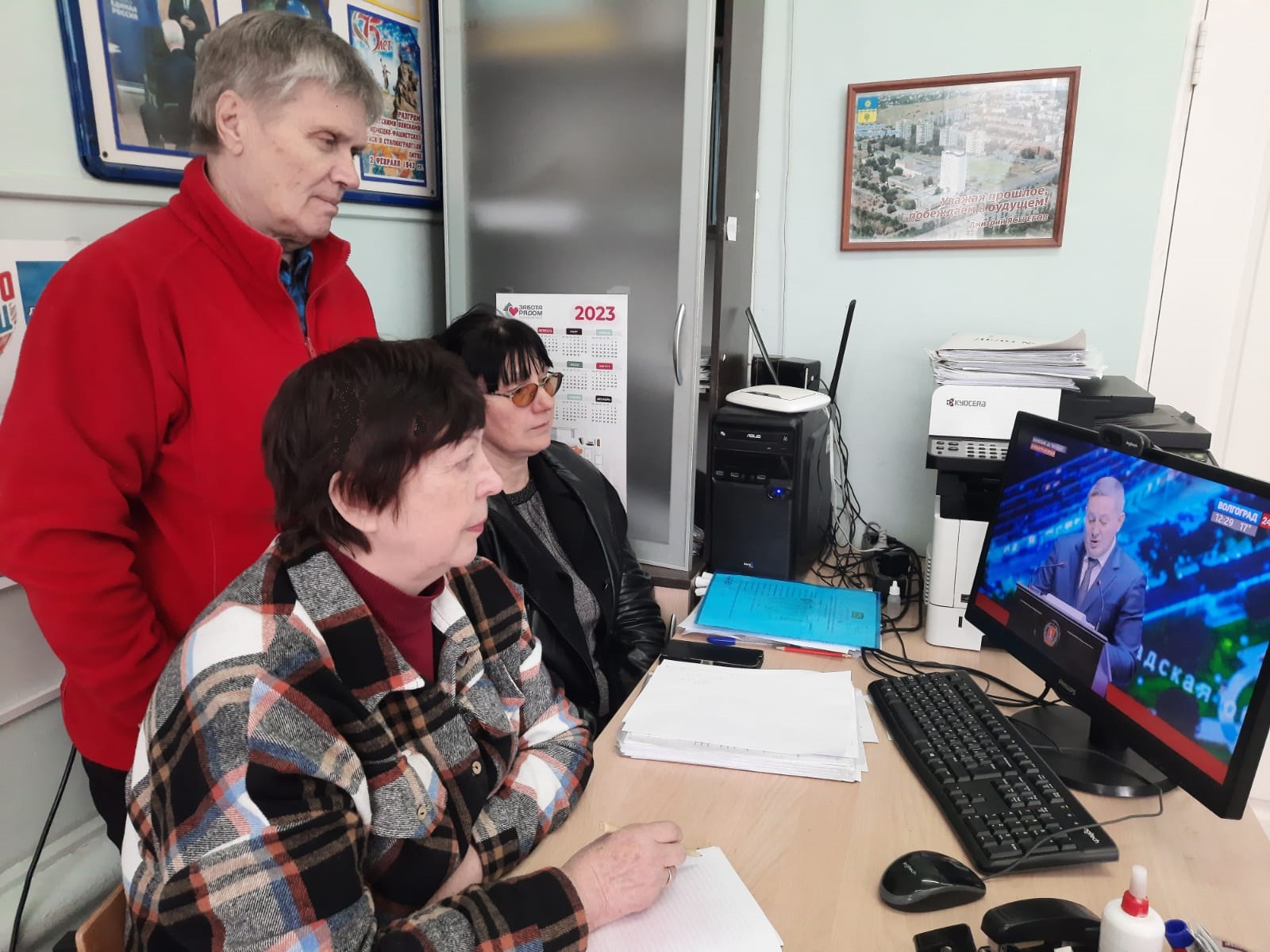 Активисты волжской общественной организации «Школа социальной активности» собрались в офисе на ул. Чайковского, 10. «Серебряные» волонтеры вместе со всем регионом следят за выступлением Андрея Бочарова.