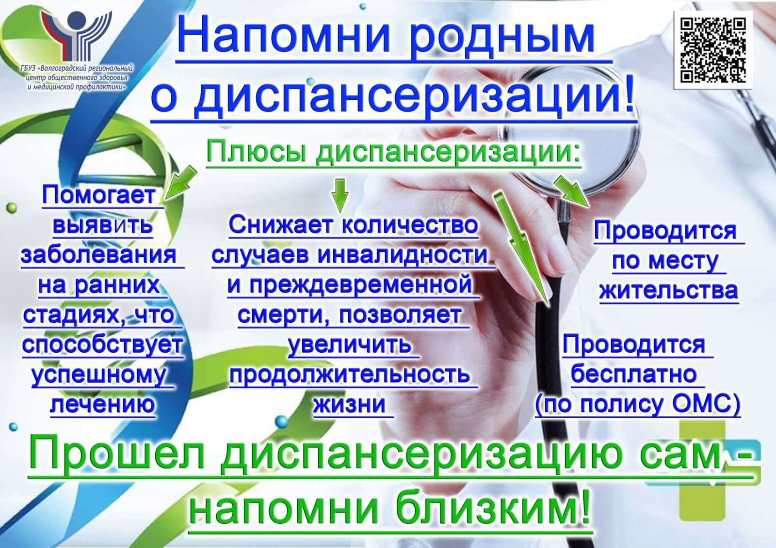 Диспансеризация проводится бесплатно по полису ОМС в поликлинике по месту жительства (прикрепления). Она позволяет укрепить здоровье, выявить заболевание как можно раньше, лечить болезнь с наибольшим успехом.